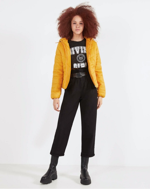 The insulated jacket is made of leather. A light layer of insulation. Details: stand-up collar, zipper, two pockets on the sides.